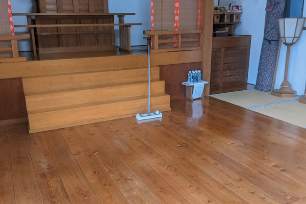 教会では毎朝、神殿掃除をしています。タイトル画像のモップを使って神床(木の床の部分)を拭きます。畳はコードレスの掃除機を……